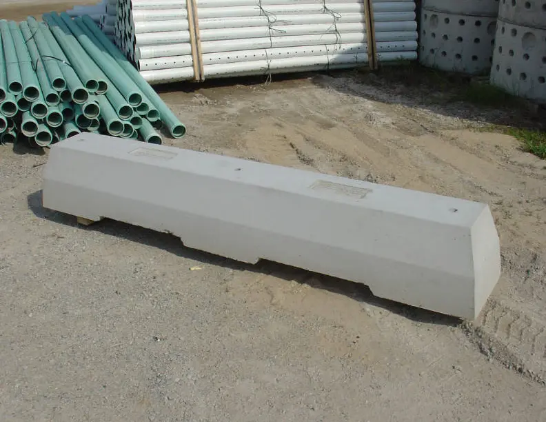 Precast Reinforced Bumper Blocks for use in parking lots are available in 4′, 6′, 7′, and 8′ lengths. The 8′ long Truck Bumper Block is considerably larger and more durable for use in heavy truck traffic than the standard blocks.